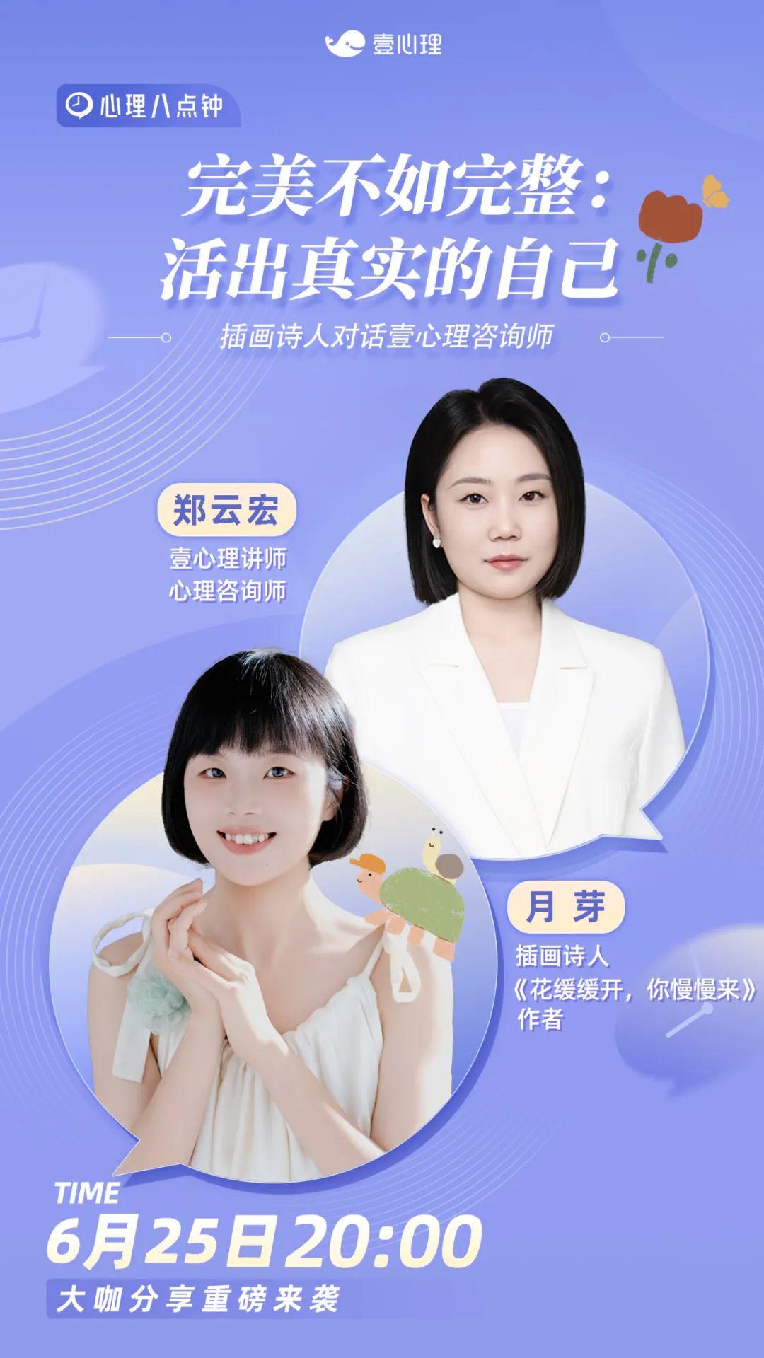 今晚八点,来壹心理视频号直播间,和月芽老师、心理咨询师郑云宏一起,探讨如何看待“不完美”,活出真实的自己。