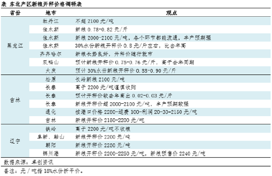 随着新粮上市期临近,市场普遍对新粮开秤价关注度较高。据电话调研了解,产区贸易环节普遍认为新粮价格将“高开”,预期较去年同期高60-100元/吨。从下表中可看出,黑龙江东部新粮开秤价初步预期在1500-1640元/吨,西部在1760-1800元/吨,超过2100元/吨或抑制贸易商采购积极性;吉林新粮开秤价预期在2100-2200元/吨;辽宁基本在2200-2250元/吨。具体调研数据见下表内容。除此之外,也有个别深加工企业的开秤价基本与去年持平。