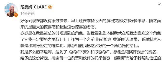 9月26日鸿岳资本,第38届中国电影金鸡奖提名公布,段奥娟凭《岁岁平安》入围金鸡奖最佳女主角,引发系列热议。