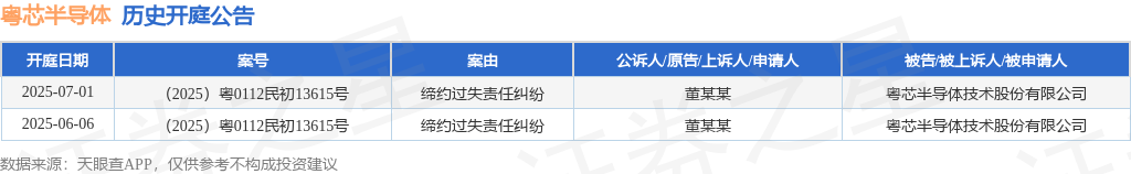 案号:(2025)粤0112民初13615号审理法院:广州市黄埔区人民法院案由:缔约过失责任纠纷当事人信息: 原告/上诉人:董某某 被告/被上诉人:粤芯半导体技术股份有限公司开庭日期:2025年7月1日根据统计,近一年内以粤芯半导体技术股份有限公司为当事人的历史开庭公告有2则,其中案由为“缔约过失责任纠纷”的公告以2则居首。历史开庭公告如下: