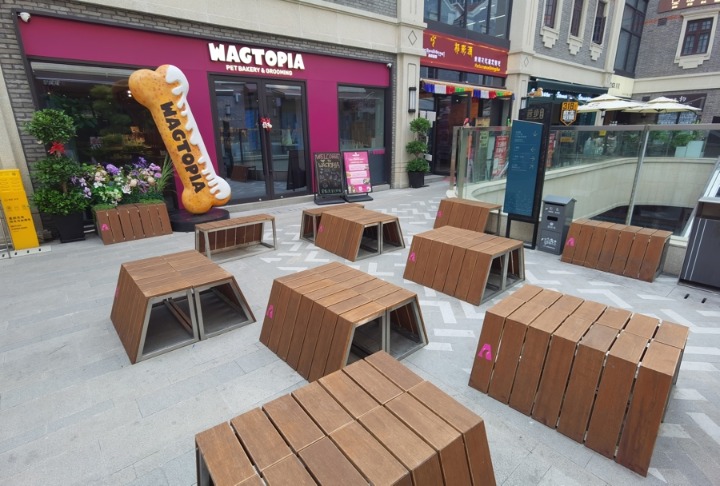昔步·统益里,以宠物烘焙和美容服务为特色的全国首店“WAGTOPIA”靠门前十多个外摆的宠物跑梯吸引了大量客流陈玺撼摄