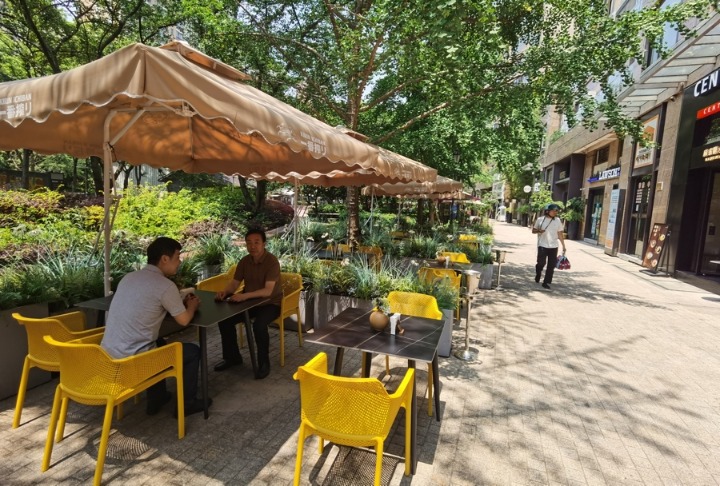 近期,步行街280多家商户在外摆位上达成共识,在外摆位与门店之间留出至少1.5米,一些外摆位调整桌椅和遮阳伞尺寸或定期收入店内,腾出更宽敞的人行空间。